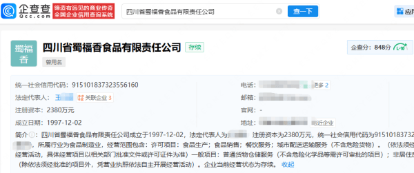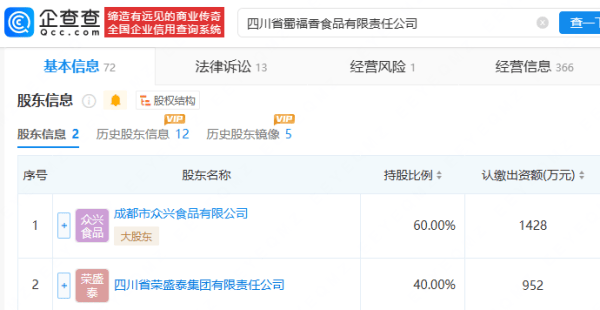 企查查APP显示,该公司成立于1997年12月,注(zhu)册(ce)资本2380万(wan)元,经营范围包括:食品生产;食品销(xiao)售;餐饮服务;城市配送运输服务等,由成都市众兴(xing)食品有限公司、四(si)川(chuan)省荣盛泰集团有限责任公司共同持股。该公司对外投资了成都蜀香汇食品有限公司,持股比例(li)40%。