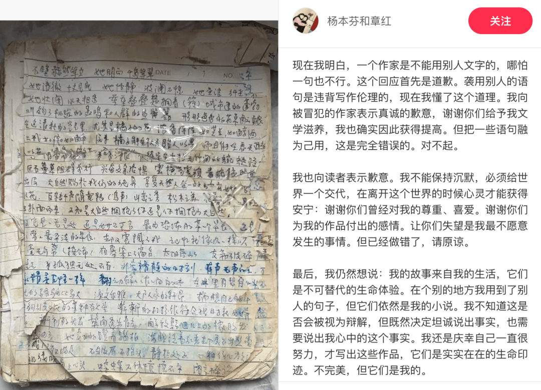 小红书账号“杨(yang)本芬和章红”发布回应