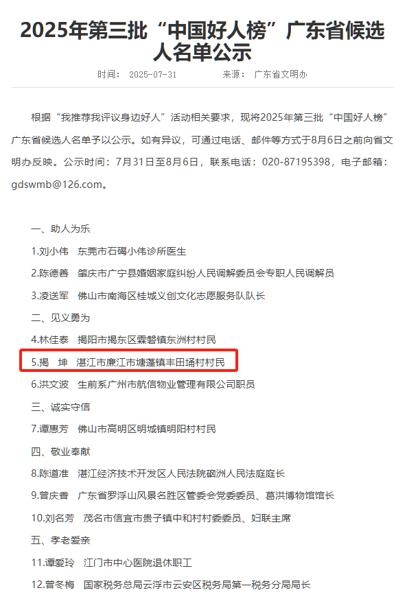 湛(zhan)江(jiang)小伙揭坤入选《2025年第(di)三批“中国好人榜”广东省候选人名单公示》。