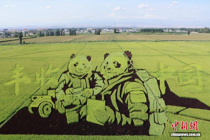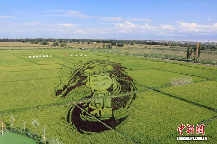 8月8日,新疆伊犁察布查尔县(xian)纳(na)达齐牛录(lu)乡巨幅稻田画迎来(lai)最好观赏期,图为(wei)“丰产(chan)中国”主题稻田画。中新社记(ji)者 蒋文月 摄