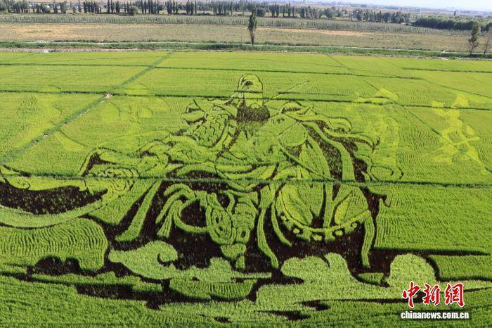 8月8日,新疆伊犁察布查尔县(xian)纳(na)达齐牛录(lu)乡巨幅稻田画迎来(lai)最好观赏期,图为(wei)“哪吒闹海”主题稻田画。中新社记(ji)者 蒋文月 摄