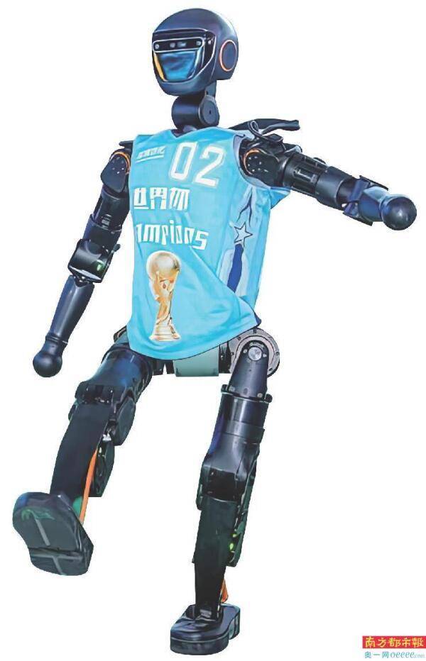 人形机器人在智慧娱乐机器人主题展区踢足球。