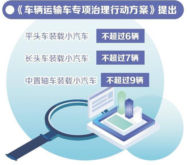行动方案要求,一方面(mian)要严格新增车辆市场准入管理。进一步加强(qiang)对车辆注册登记、市场准入的监管,强(qiang)化对新增车辆运输车外廓尺寸(cun)查验,凡不符合(he)国家标准的,公安交通管理部门不予注册登记,交通运输主(zhu)管部门不予配发道(dao)路运输证(zheng)。另一方面(mian)要强(qiang)化源头装载监管。各(ge)地交通运输主(zhu)管部门要加强(qiang)对辖区内乘用车制造(zao)企业的乘用车装车点管理,督促企业使用符合(he)国家标准要求的车辆运输车合(he)规装载运输。行动方案还专门配发了合(he)规车辆运输车装载示意图,可操作性强(qiang)。