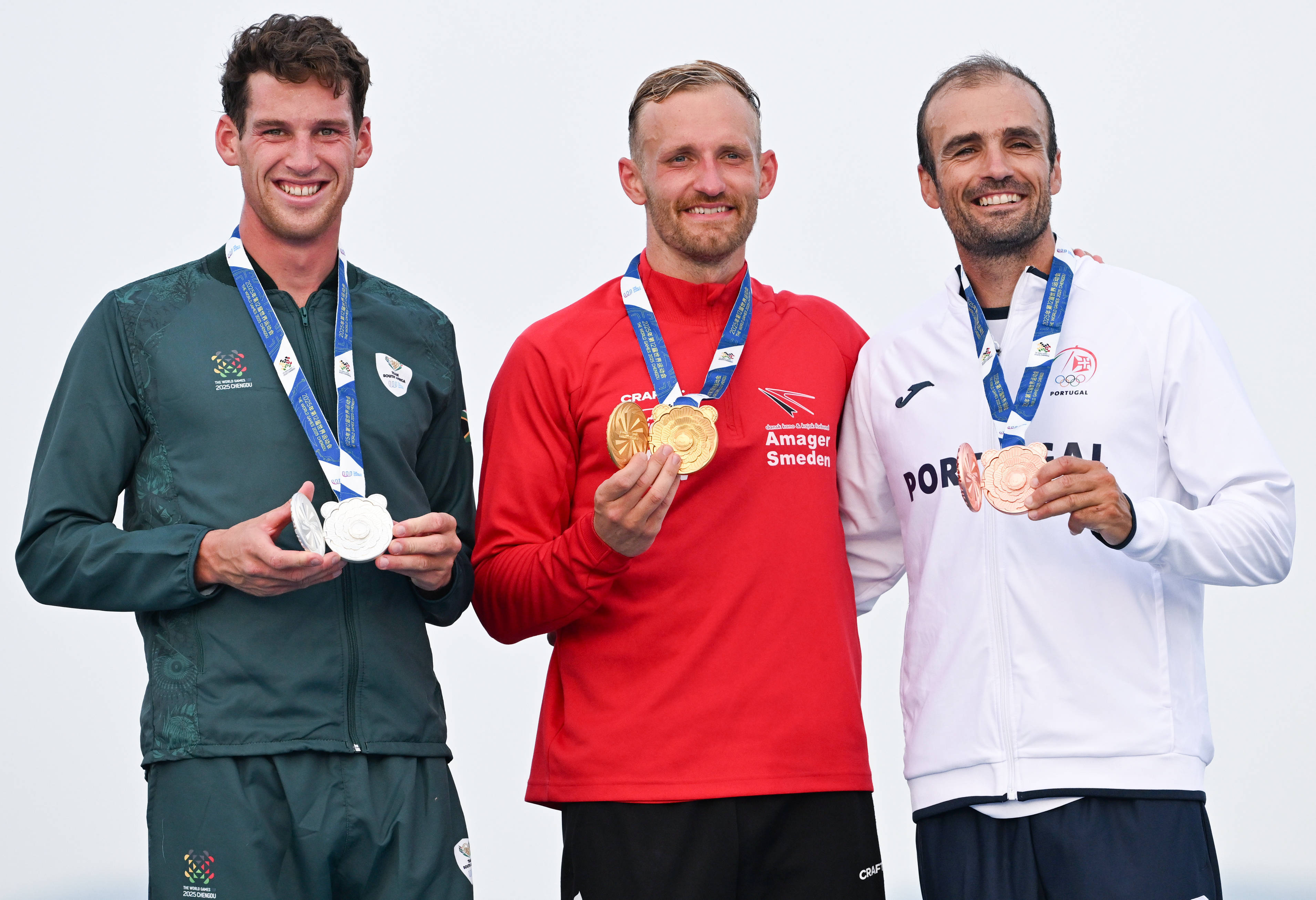 8月9日,冠军丹麦选手彼得森(中)、亚军南非选手洛夫莫尔(er)(左)和季军葡萄牙选手拉马略在颁奖典礼(li)上。 新华社记者 李嘉南 摄