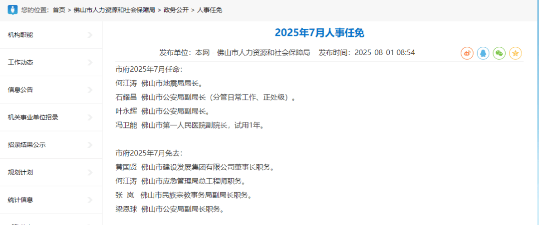 近日,佛山市人社局网站公布佛山市人民政(zheng)府(fu)2025年7月任免情况,其中,何江涛任佛山市地震局局长。