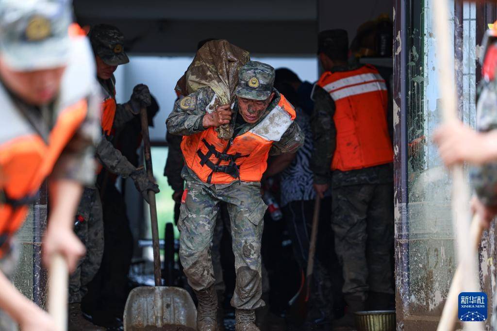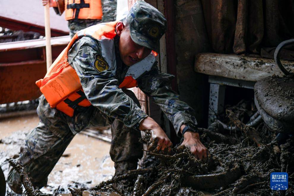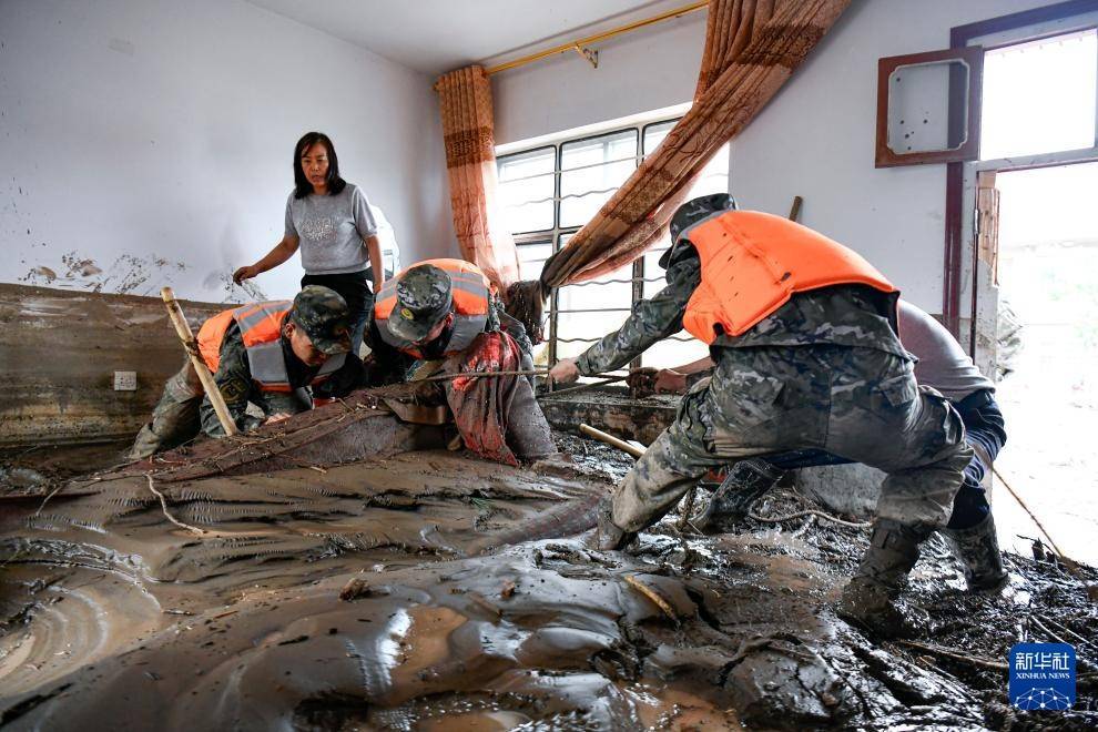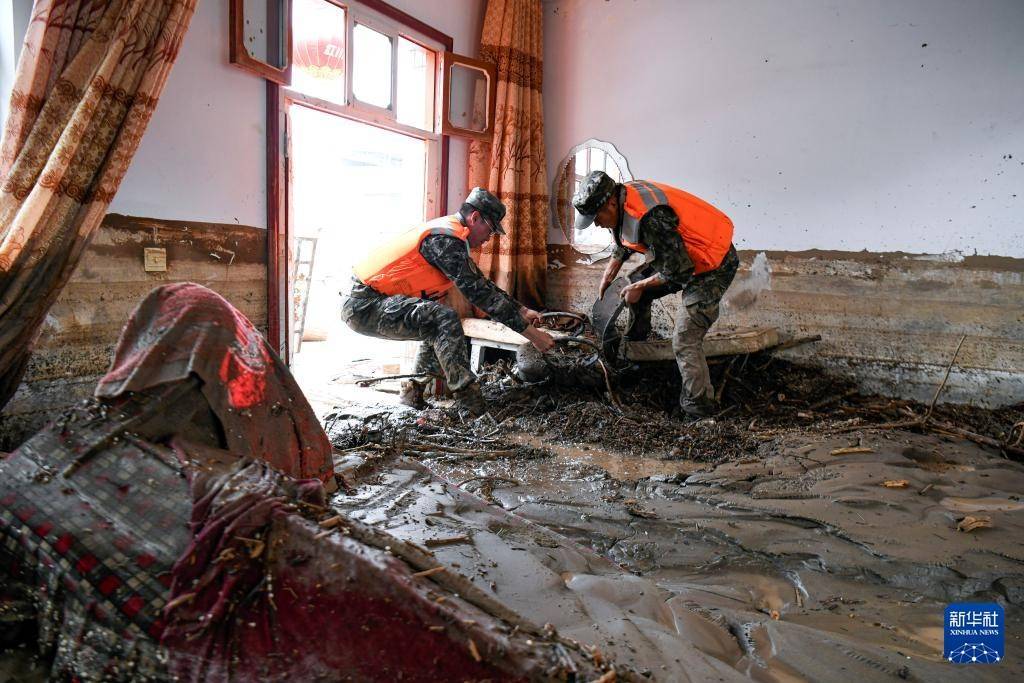 8月9日,武警甘肃总队机动支队官兵在兰州市榆(yu)中县(xian)城关镇兴隆山村清理淤泥(ni)。