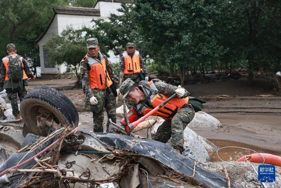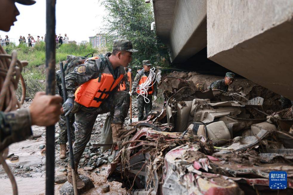 8月9日,武警甘肃总队兰州支队官兵在兰州市榆(yu)中县(xian)城河(he)道搜索受灾村民丢失物(wu)资。