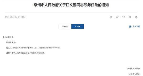 我国网财经7月10日讯 近日,泉州市(shi)人民政(zheng)府公布一则关照显示,提名江文鹏为(wei)泉州银行董事(shi)长人选,不再担任泉州银行行长职务。