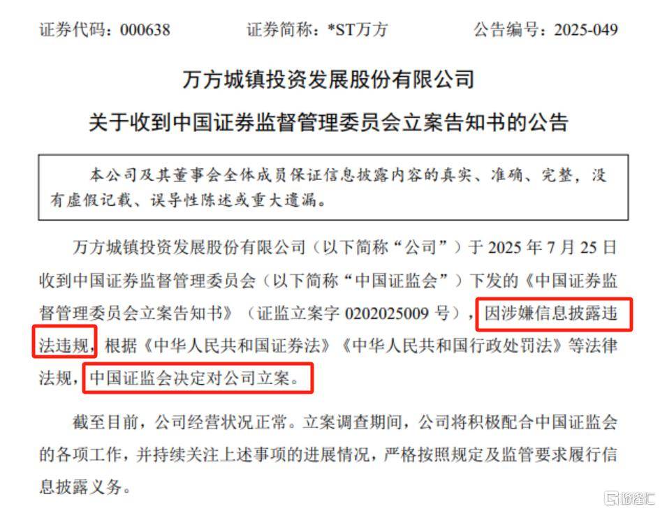 7月25日晚间,*ST万方(000638.SZ)表露公告称,公司当日收到证监会下发的《我国证券监督管理委员会立案告知书(shu)》,因涉嫌信息表露违法(fa)违规,公司被(bei)证监会立案调查。