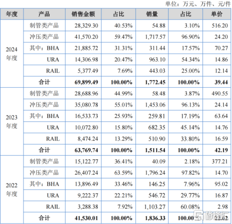 2022年、2023年和(he)2024年(简称(cheng)“呈报期(qi)”),公司冲压类产品的(de)营收占比均为55%以上,制管类产品的(de)营收占比均为36%以上。