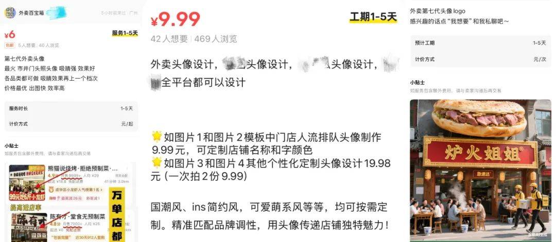 部分电商平(ping)台甚至(zhi)涌现专门提供AI外(wai)卖美图设计的店铺,免(mian)费几元到上百元不等。有的9.99元便可(ke)建造一(yi)张门店人流排队头像,可(ke)定制店铺称号,能够改到中意(yi)为止。有的免(mian)费几十元,以打造“有故事感的外(wai)卖头像”吸引商家(jia)购买,并承诺(nuo)改到平(ping)台过审为止。实际上,都是用AI生成(cheng)一(yi)些风格类似的图片。观察(cha)发现,有的卖家(jia)是个人设计师,有的卖家(jia)则是专门从(cong)事外(wai)卖运营的中介,不但提供外(wai)卖门店整套(tao)的AI包装设计图,还可(ke)提供所谓“外(wai)卖全链对(dui)象集”。
