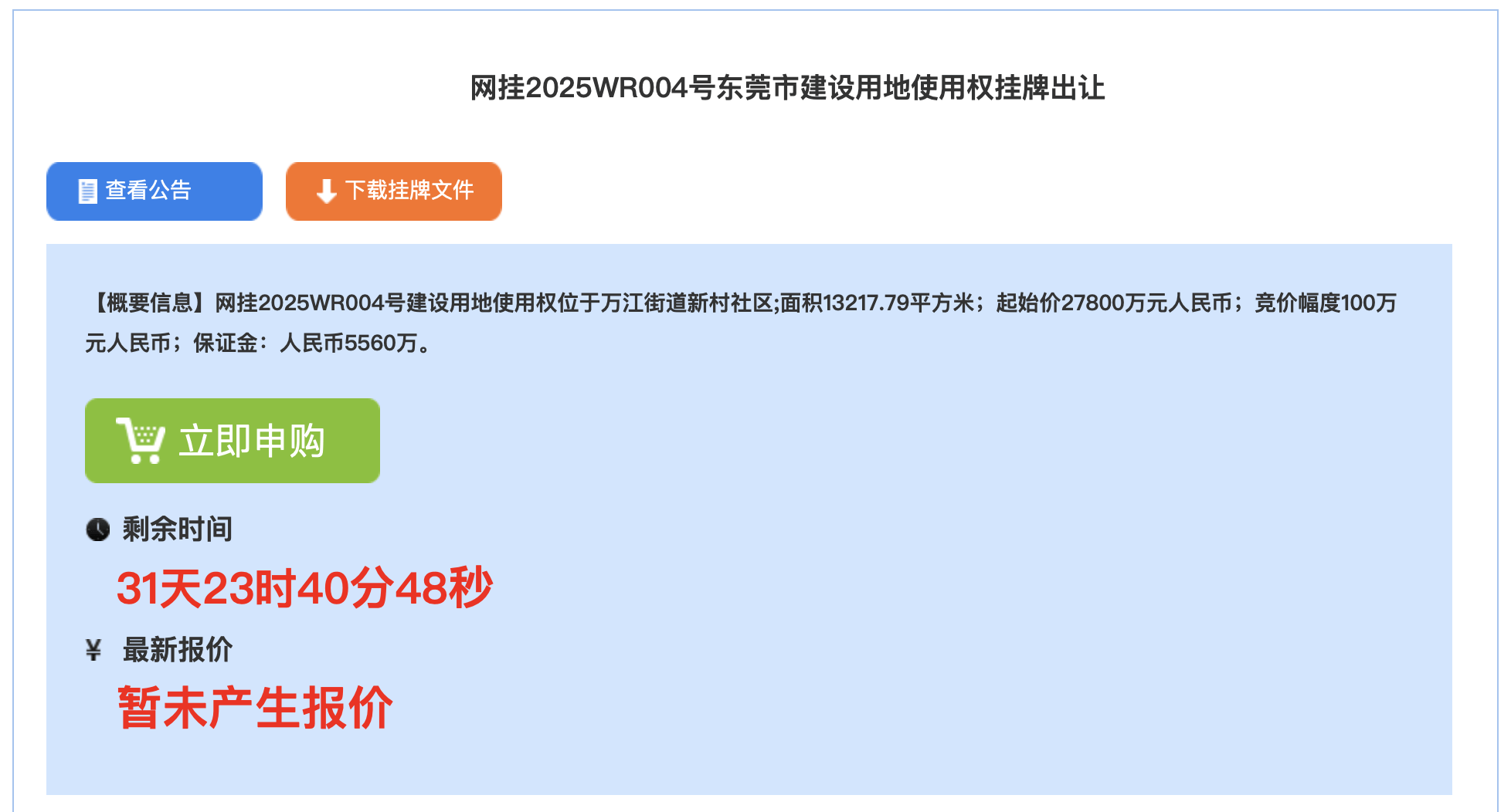 据东莞市公共资源生意业务网信息,该宗职位于万江街道新村社区,面积13217.79平方米,起拍价27800万元。根据计划扶植要求,该地块开发扶植期(qi)为30个月,宗地扶植项目正在(zai)2026年4月8日前开工,正在(zai)2028年10月8日前完工。