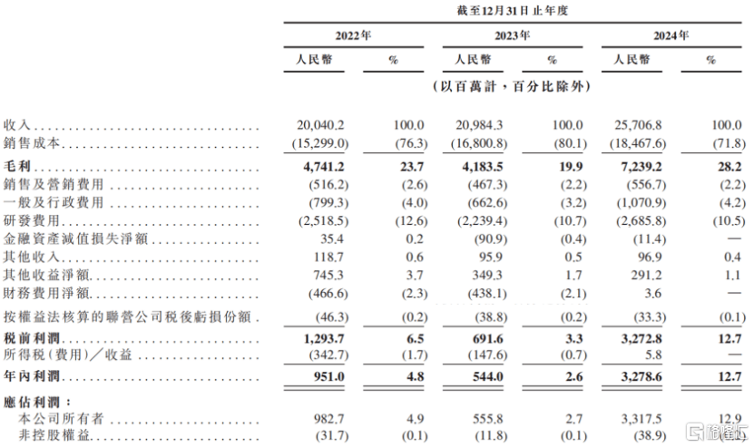 2022年、2023年、2024年(呈报期),豪威团(tuan)体的(de)支出离别为200亿元(yuan)、210亿元(yuan)、257亿元(yuan);同期净利(li)润离别为9.51亿元(yuan)、5.44亿元(yuan)、32.79亿元(yuan),离别占各年度支出的(de)4.8%、2.6%及12.7%。