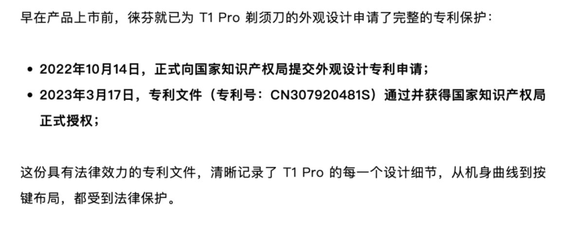 但实际环境却是,徕芬剃须刀外观专利在2022年提交,专利号ZL 202230679628.4。2023年,徕芬剃须刀原型机曾在牙刷发布会上公然亮相。